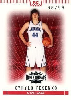 The 2007 Topps Triple Threads #113 Kyrylo Fesenko is a collectible trading card from the Topps Triple Threads set, known for its high-quality production and premium materials. This card features Kyrylo Fesenko, a rookie player, and is categorized as a base card within the set. As a basketball trading card, it is highly sought after by collectors, particularly those focused on rookie cards and memorabilia from the 2007 season. The card's design emphasizes the elite nature of the Triple Threads series, making it a notable addition to any basketball card collection.