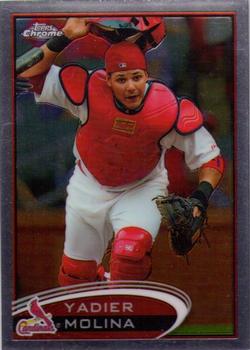 The 2012 Topps Chrome #97 Yadier Molina is a base trading card from the Topps Chrome set, featuring the revered St. Louis Cardinals catcher. This card, part of a well-regarded series known for its shiny surface and premium feel, does not represent a rookie or memorabilia card, but it is collectible due to Molina's significant impact on the sport and his status as a multi-time All-Star and World Series champion. As a standard base card, it is sought after by fans and collectors alike for its aesthetic appeal and association with a key player in baseball history.