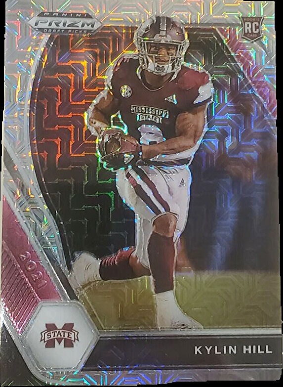 The '2021 Panini Prizm Draft Picks Collegiate Mojo #118 Kylin Hill' is a trading card that highlights Kylin Hill, an emerging football player. This card is part of the 2021 Panini Prizm Draft Picks Collegiate set and features the Mojo parallel variation, which is known for its unique visual appeal. As card number 118, it represents Hill's rookie season but is categorized as a parallel rather than a rookie card. It is not a memorabilia card, emphasizing its status as a standard single within the broader collectible market. The Mojo variation is particularly sought after by collectors for its scarcity and aesthetic qualities.